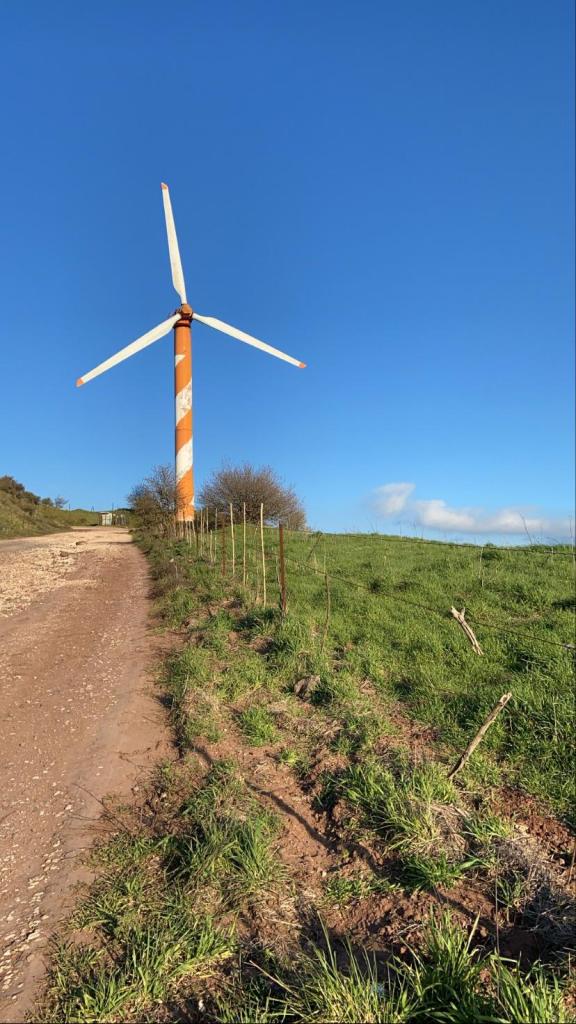 כשנסענו על כביש 98 דרומה לתל סאקי , ראינו על הדרך את ההר עם הטורבינות וכמה מכוניות חונות על הדרך. בדרך חזרה חיפשנו מקום להפסקת תה ועצרנו באותו המקום. התחלנו לעלות כדי למצוא מקום להפסקה שלנו , ובסופו של דבר הגענו כמעט עד הפסגה. זהו חלק משביל הגולן. הנוף מלמעלה יפיפה , השילוב של הירוק עם הרי הגעש הבזלתיים ממכר. על פסגת ההר בגובה 1050 מ' שוכנת חוות הטורבינות בה יש עשר טורבינות רוח לייצור חשמל.