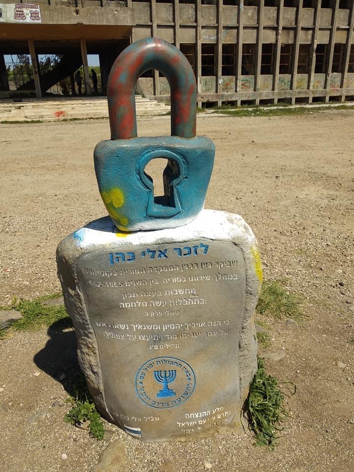אנדרטה שמוצבת לפני בניין המפקדה הסורית , אבן בזלת עם ציטוטים מספר משלי ותהלים בענייני תחבולות, סוד ומודיעין המוטבעים על האבן . גם סמל המוסד הישראלי מוטבע כאן, מעל האבן מנעול מפוסל שדרכו נראה מבנה המפקדה העצום. המנעול מסמל את עבודת המודיעין שמטרתה פריצת המנעול של מוסדות אחרים. אלי כהן עבר במפקדה זו כמה פעמים מפני שהוא היה זקוק לחתימת קצין המודיעין של המפקדה על מנת להמשיך לתוך השטח הצבאי הסגור,