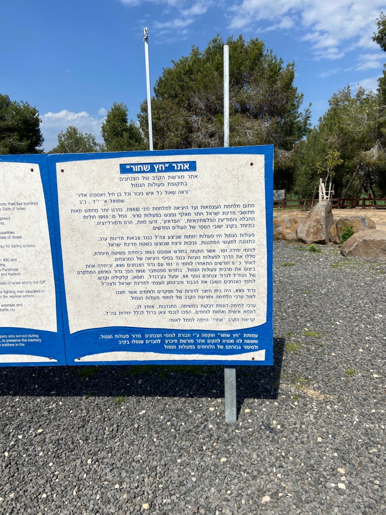 תחנה ראשונה הייתה אתר חץ שחור שהוקם ע"י מילואימניקים מיחידת הצנחנים. זהו אתר מורשת הקרב של הצנחנים מתקופת פעולות הגמול בשנים 1956 -1953. האתר מתאר 11 פעולות ומבצע “קדש” בכלל זה, מתוך 70 פעולות שהצנחנים ביצעו בשנים אלו. עוד באתר תצפית על רצועת עזה, חורשה לפיקניקים ובית שביתת הנשק. בשטח האנדרטה לוחות הסבר ועמדות האזנה עצמאיות המגוללות את קורותיהם של הלוחמים, המבצעים השונים וסוקרים מעט את האזור. פעולת חץ שחור עצמה התחוללה בעזה, כתגובה לפעולות חבלה ופיגועים של מסתננים מרצועת עזה לעומק המדינה בשנות החמישים.