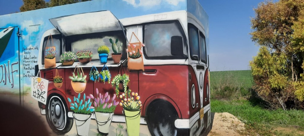 בדרך אי אפשר שלא להימנע מלראות את כל המיגוניות עם הגרפיטי המרשים עליהן. אנחנו בלב הנגב המערבי, אזור שהכי חשוף לירי מאזור רצועת עזה והרבה משמות הישובים מוכרים לנו לצערי מתקופות האזעקות.