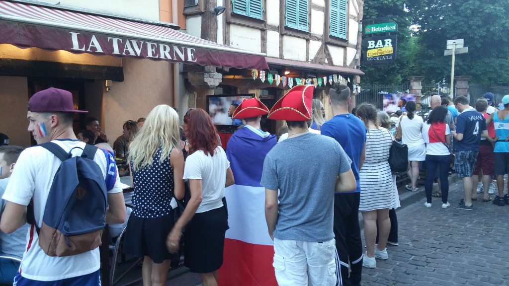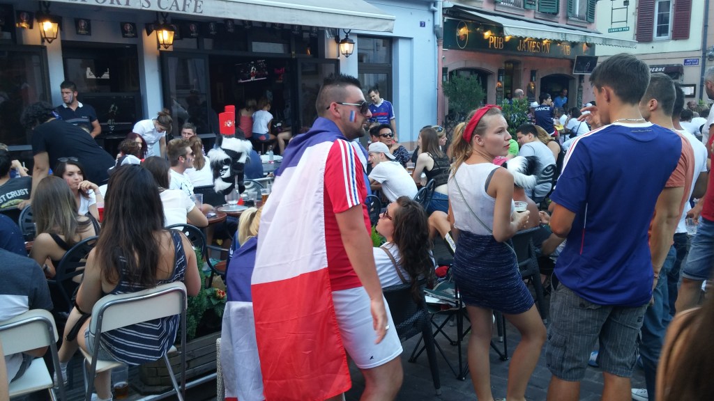 כבר בהגיענו לרחוב הראשי הרגשנו באווירה החגיגית, אנשים לבושים בצבעי הדגל הצרפתי הולכים ברחוב, צפצפות מכל עבר. אווירת פסטיבל. כמובן שעד שהגענו כבר רוב המקומות עם הטלוויזיות היו תפוסים. התיישבנו בבית קפה שהקרין את המשחק. ראינו את כולם שרים את ההמנון הצרפתי בגאווה (מאוד מרגש) ובעוד אנחנו מזמינים לנו אוכל התחיל כבר המשחק. בשלב מסוים הבן שלי רצה לראות בחדר במלון את המשחק וזה אולי היה המזל שלנו. עזבנו את בית הקפה רגע לפני שצרפת הפסידה…