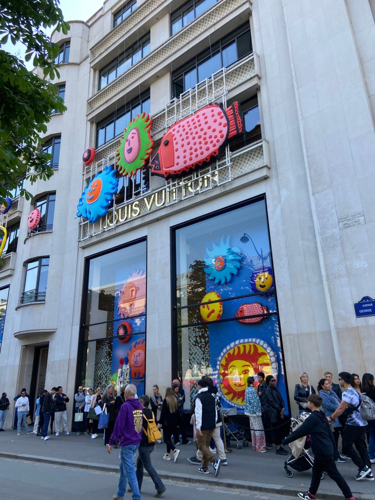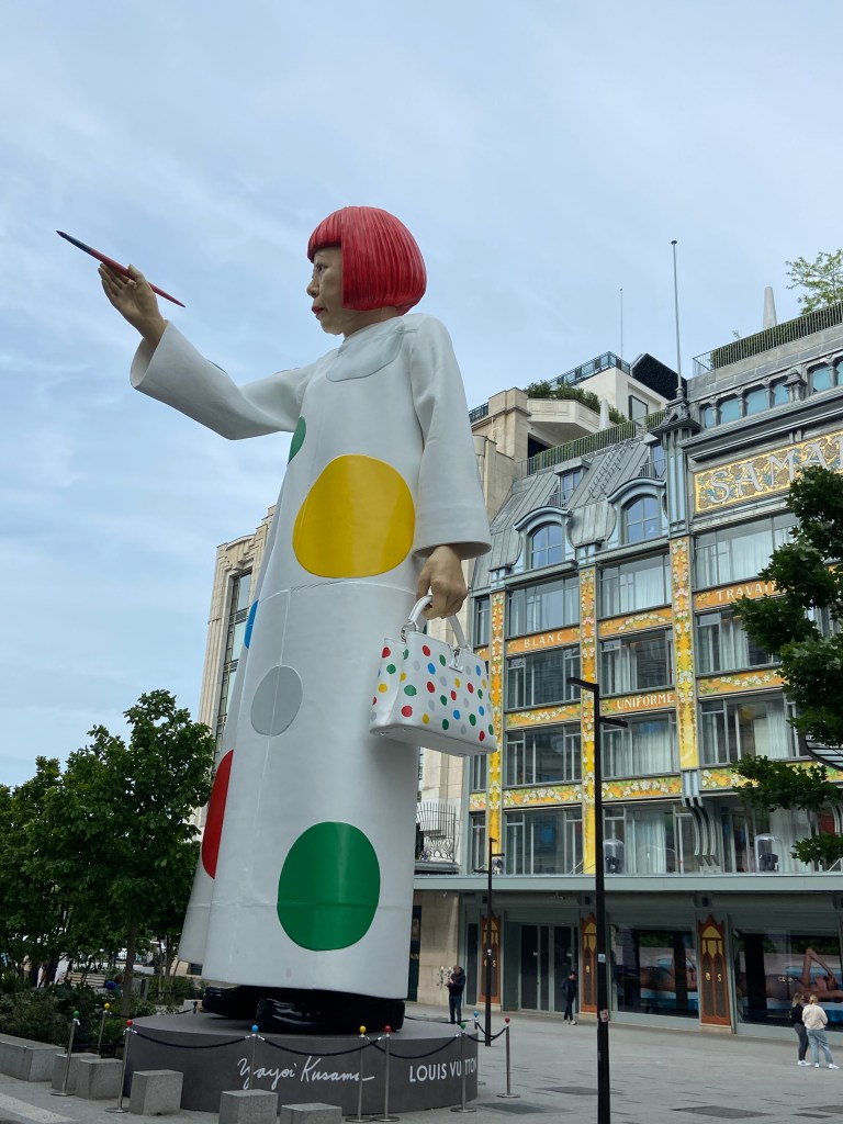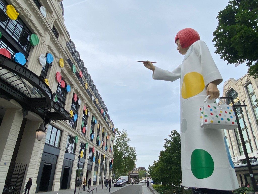 עוברים דרך LV Dream חברת לואי ויטון Louis Vuitton פתחו שם תערוכה על תולדות המותג. מוזמן לנו שם ביקור אחה"צ. אנחנו מצלמים את הפסל הענק והמרשים של האמנית יאיוי קוסמה והקישוטים על הבניין (שגם מופיעים בכל חנות של לואי ויטון). וממשיכים לתחנה הראשונה שלנו : פלה רויאל / עידכון : הפסל הגדול כבר ירד.