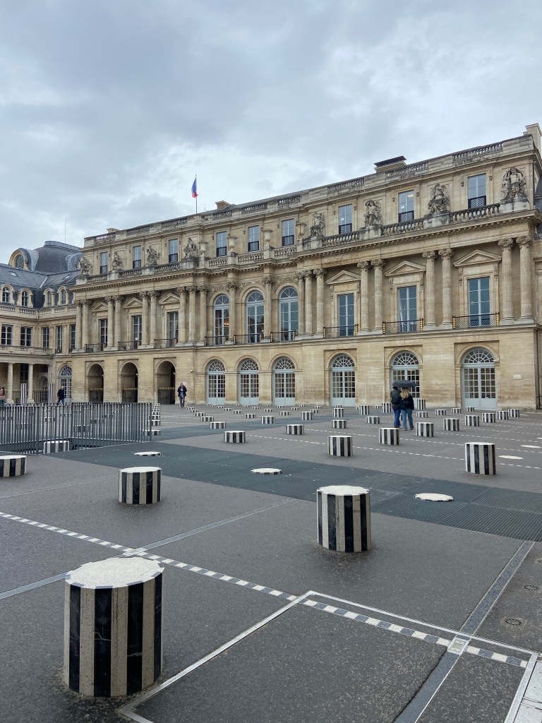 הארמון המלכותי פלה רויאל Palais-Royal נבנה במקור בשנת 1636 על ידי הקרדינל רישלייה- ובאותה תקופה נקרא "ארמון-קרדינל". רישלייה הוריש את הארמון למלך ובמהלך העשורים הבאים הוא הופך למרכז החצר המלכותית. מאוחר יותר הורחב הארמון ושימש כאזור מסחר. המלך לואי פיליפ החליט לסגור את החנויות בשנת 1830. הוא נשרף במרד הקומונה בפריס בשנת 1870, ואז שוחזר כדי לשמש כמשרדי ממשלה, עד היום. הפסלים בחצר עם העמודים בגבהים השונים נבנו ע"י הפסל דניאל בורן בשנת 1985.